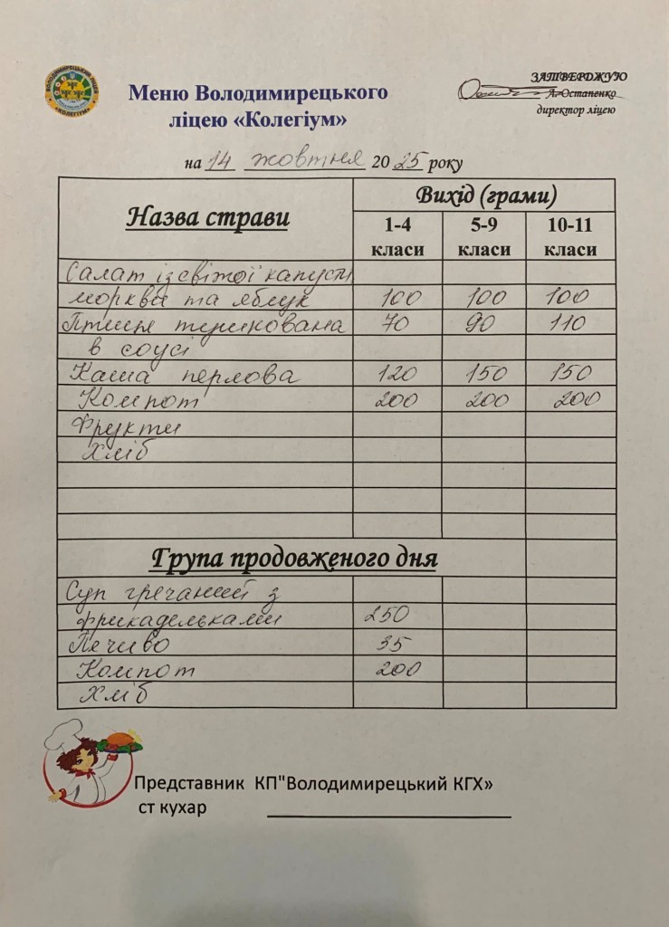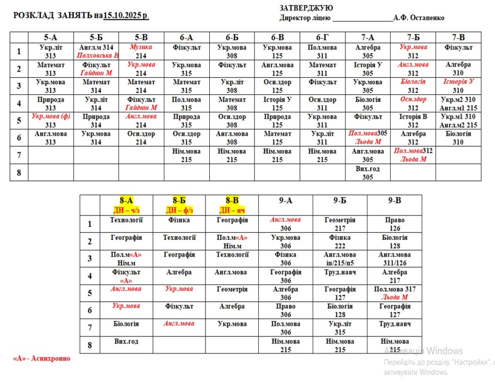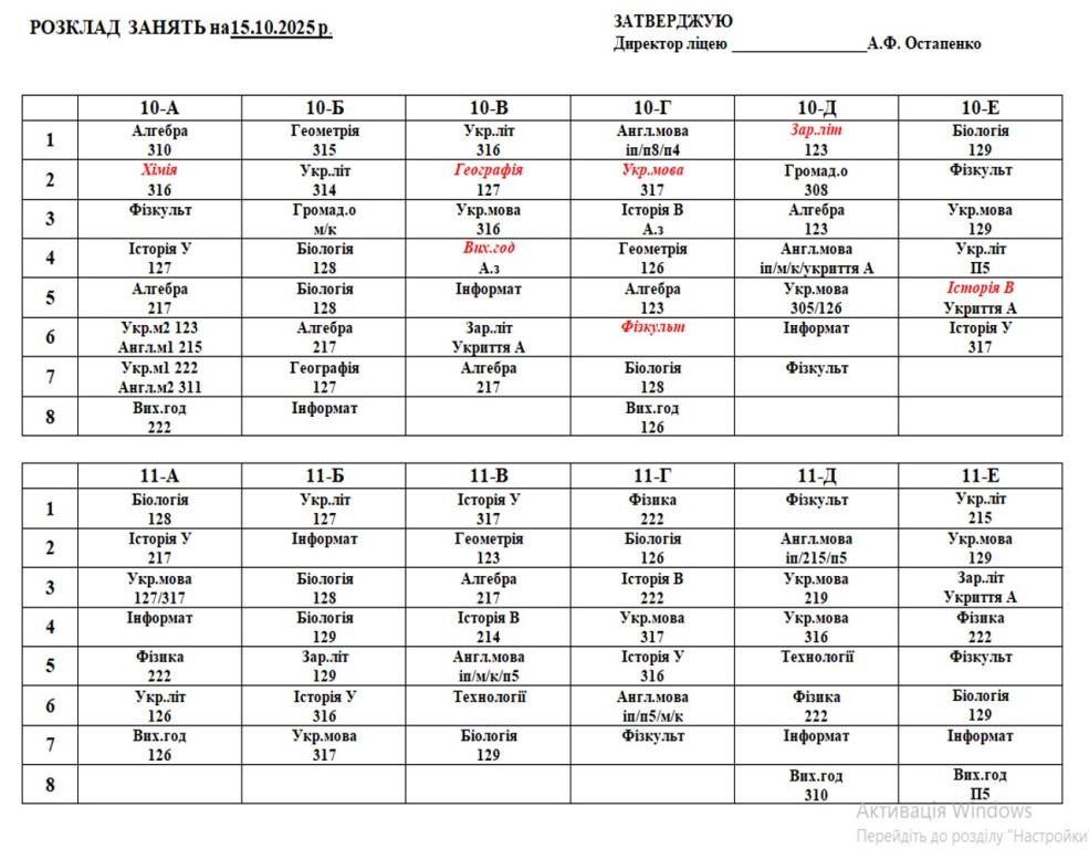 Розклад навчальних занять для учнів 5-11 класів на 15.10.2025 року