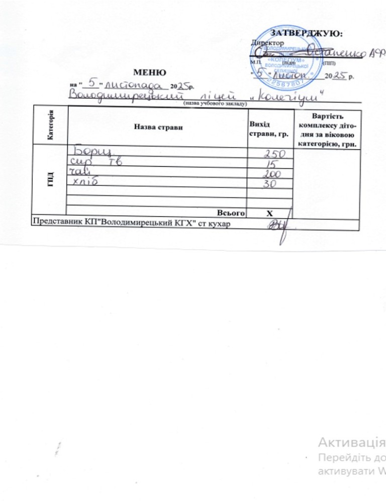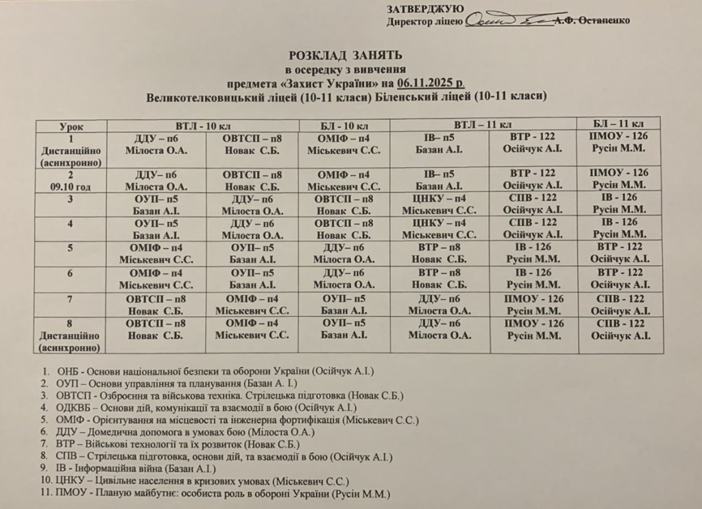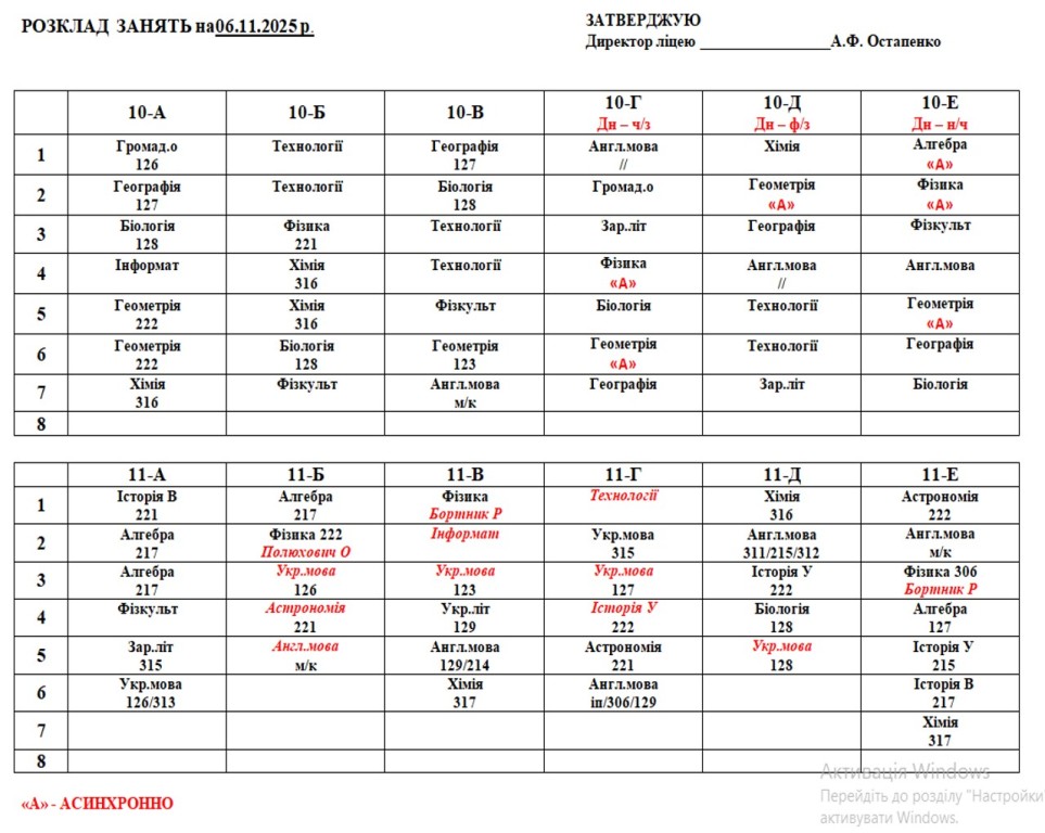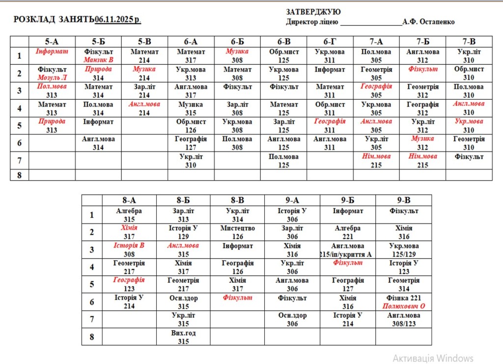 Розклад навчальних занять для учнів 1-11 класів на 06.11.2025 року