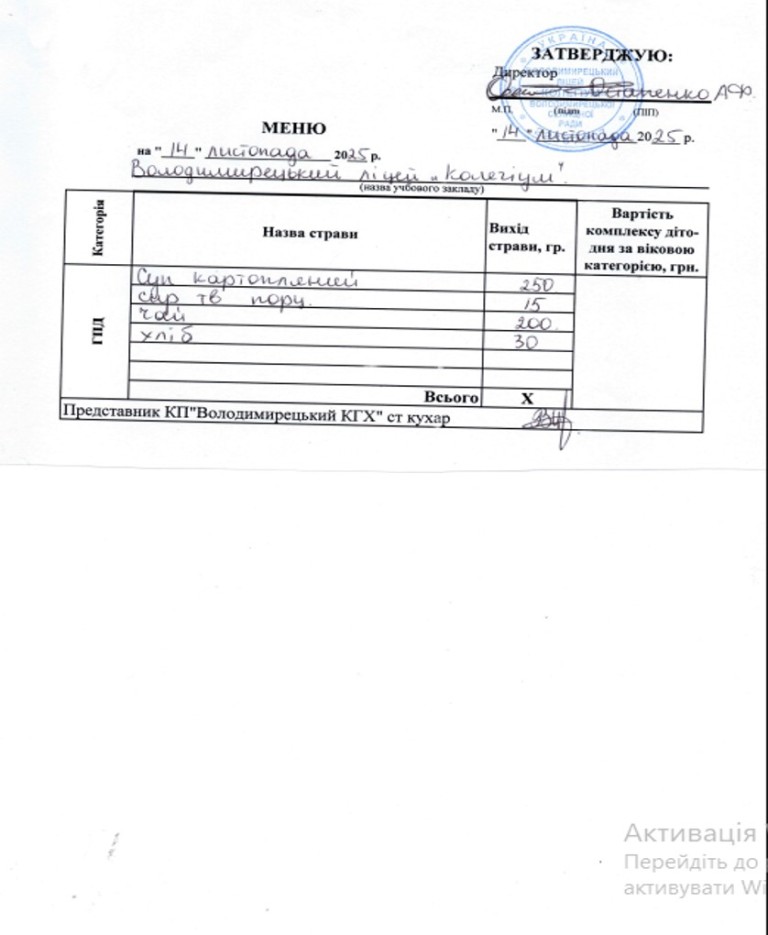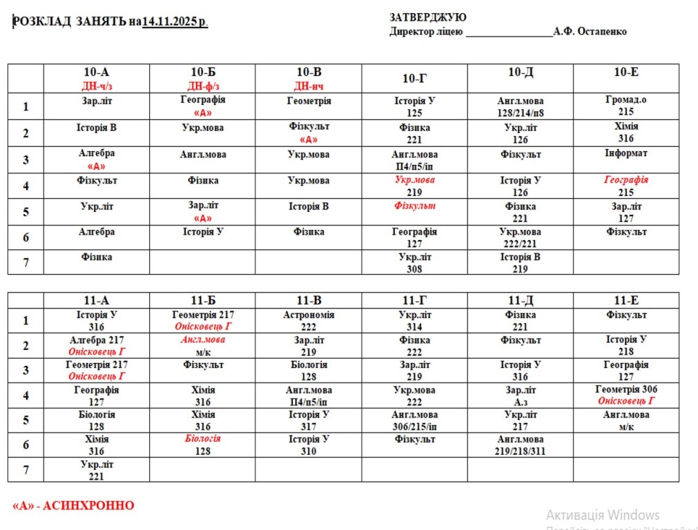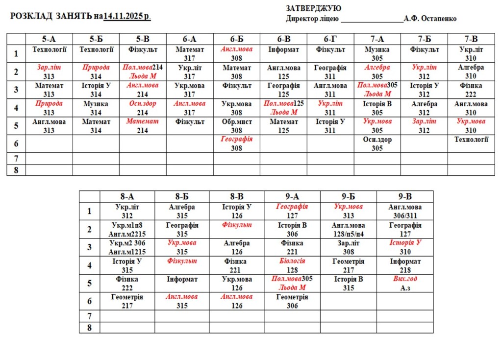 Розклад навчальних занять для учнів 1-11 класів на 14.11.2025 року