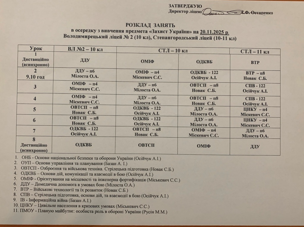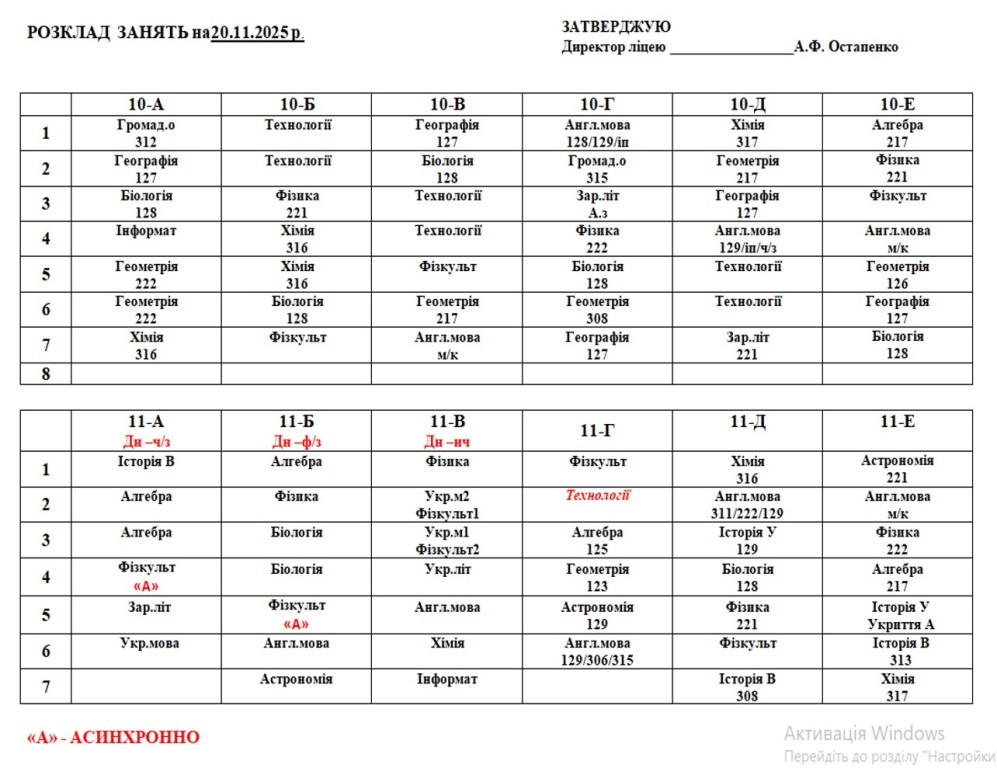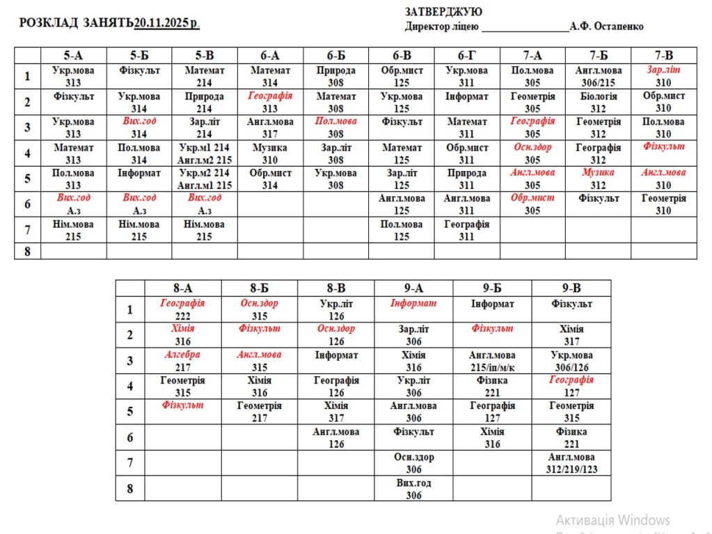 Розклад навчальних занять для учнів 1-11 класів на 20.11.2025 року