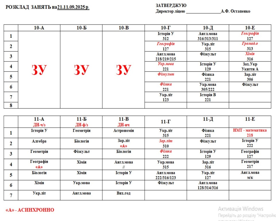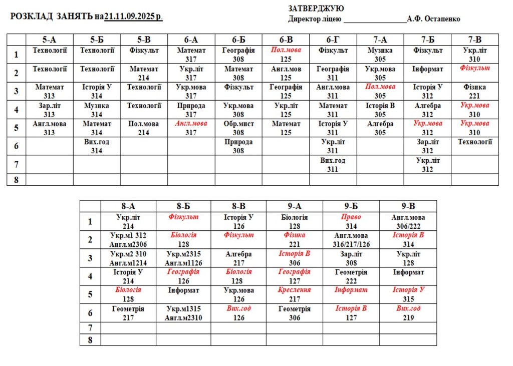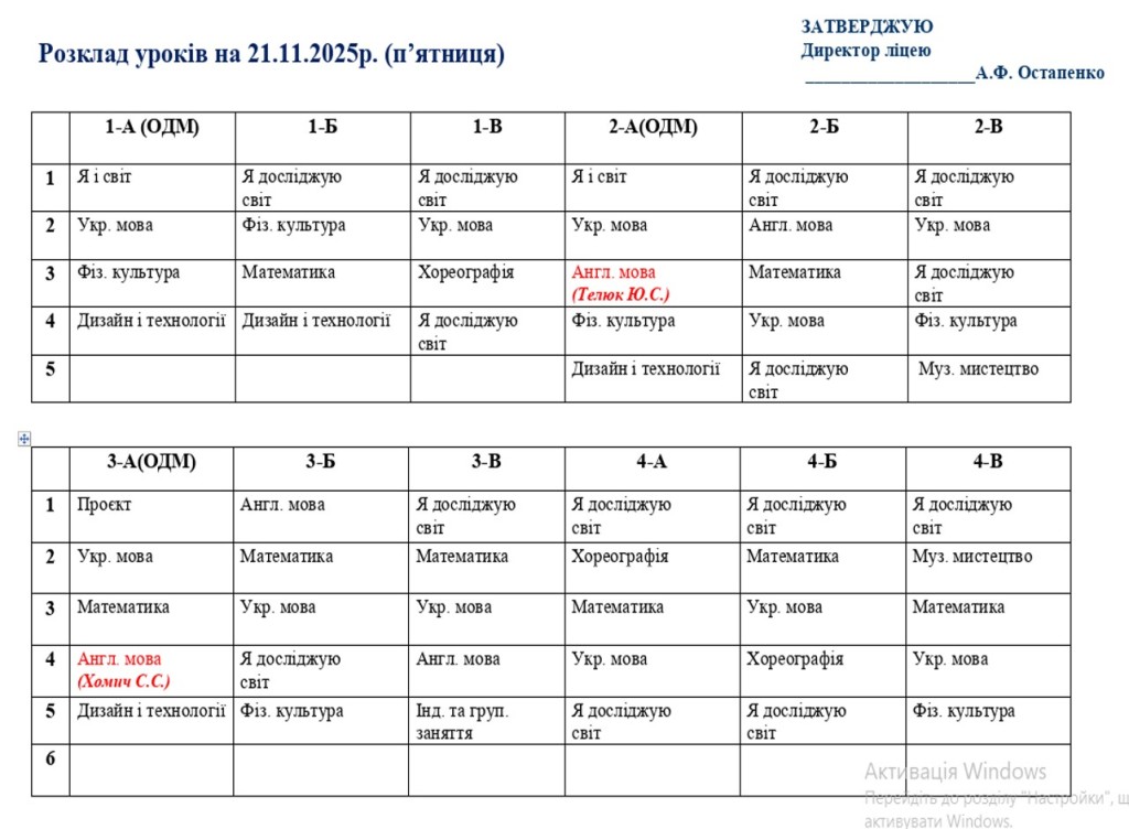 Розклад навчальних занять для учнів 1-11 класів на 21.11.2025 року