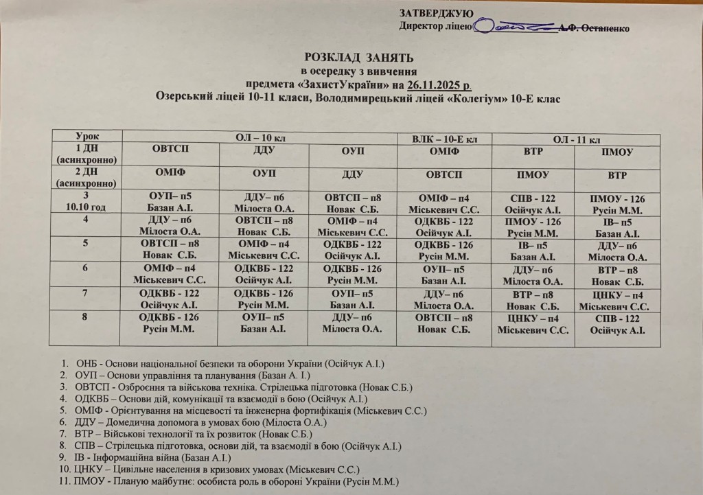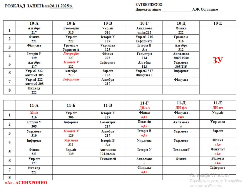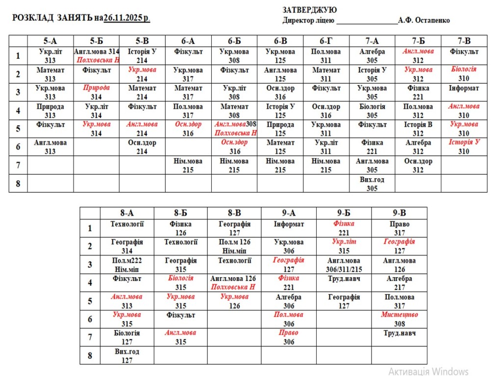 Розклад навчальних занять для учнів 1-11 класів на 26.11.2025 року