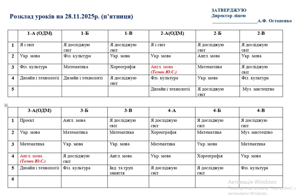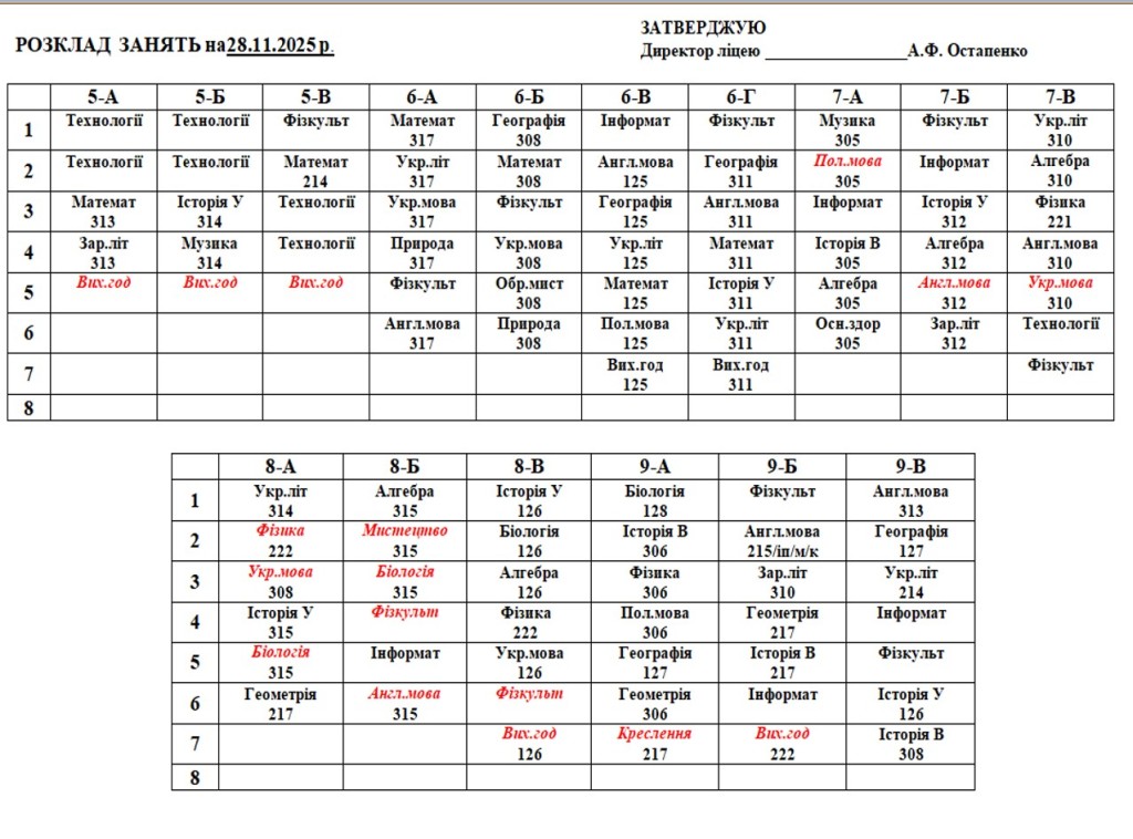 Розклад навчальних занять для учнів 1-11 класів на 28.11.2025 року