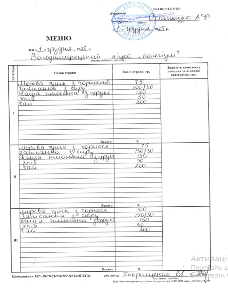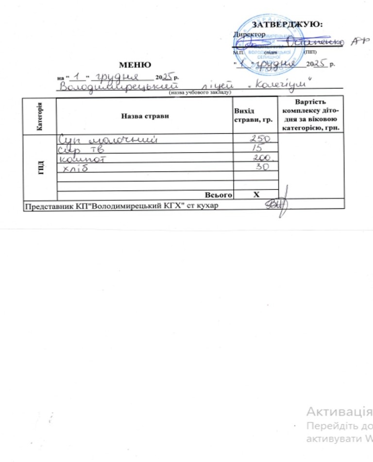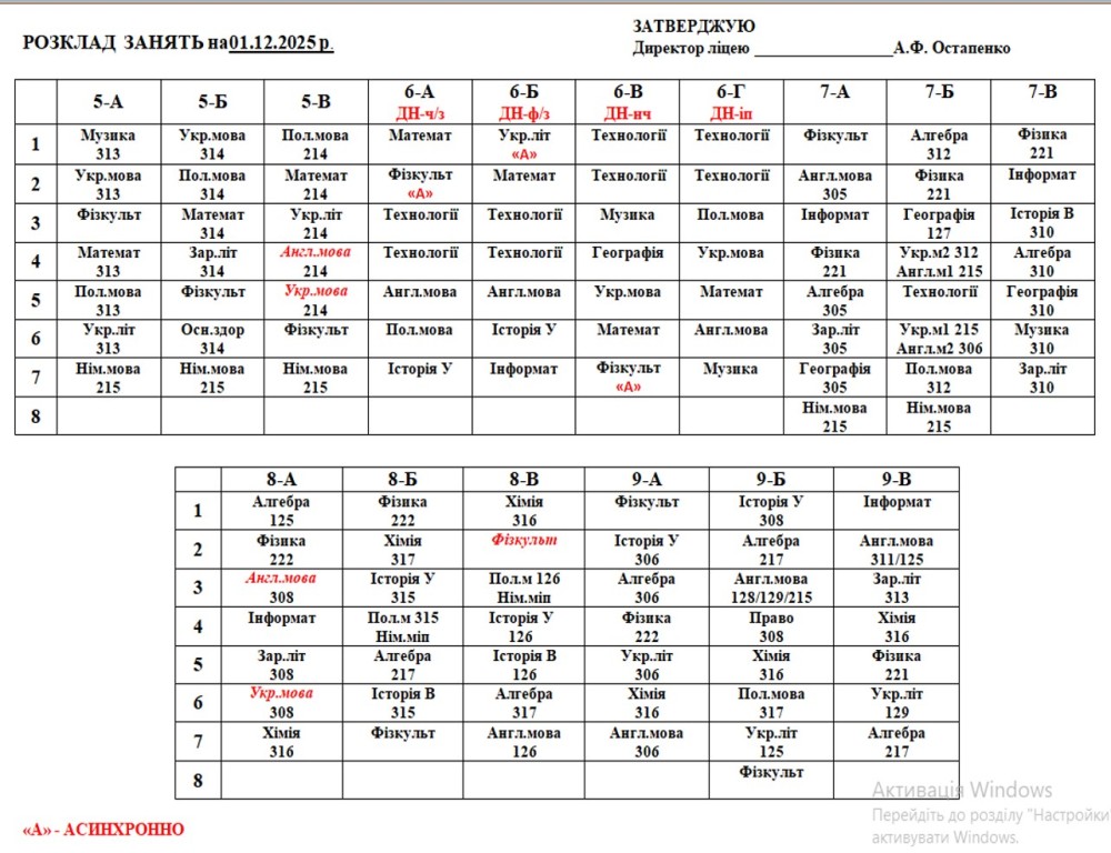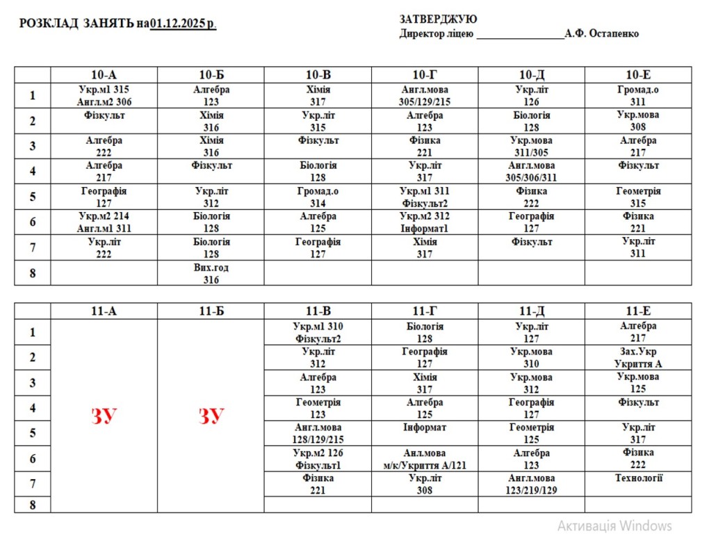 Розклад навчальних занять для учнів 1-11 класів на 01.12.2025 року
