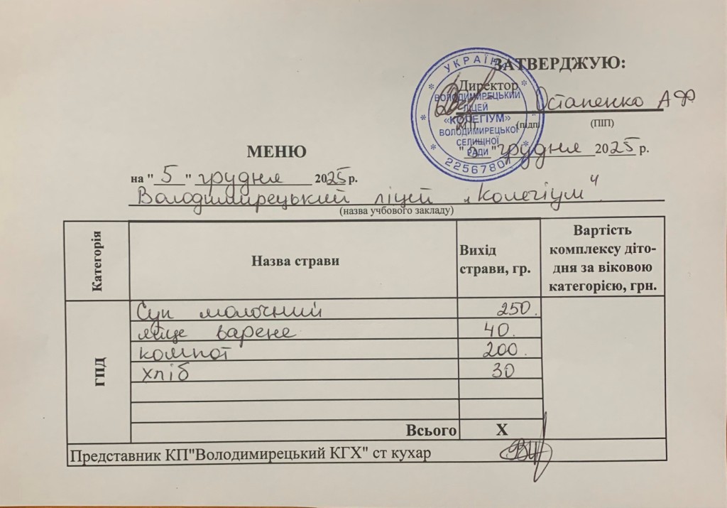 Меню на 05.12.2025 року