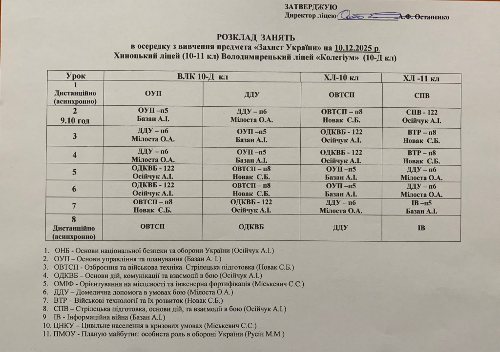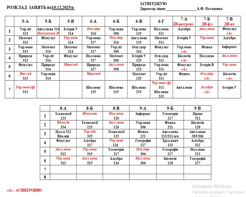 Розклад навчальних занять для учнів 1-11 класів на 10.12.2025 року