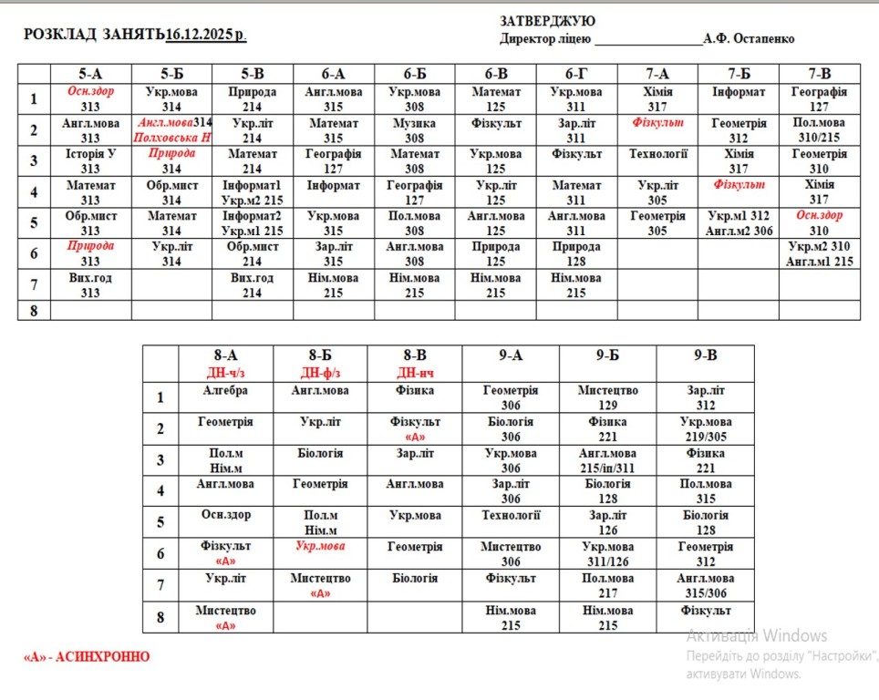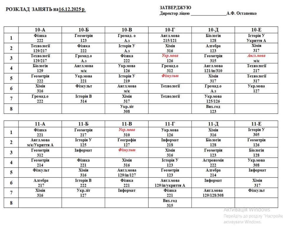 Розклад навчальних занять на 16.15.2025 року