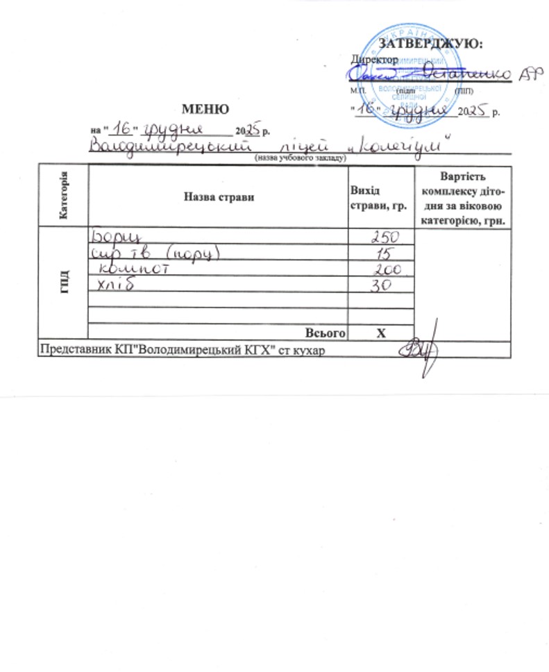 Меню на 16.12.2025 року