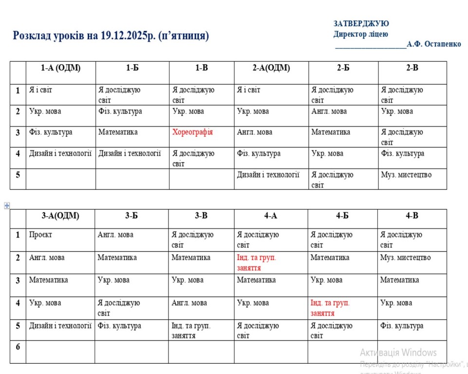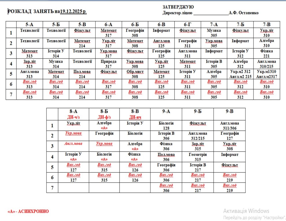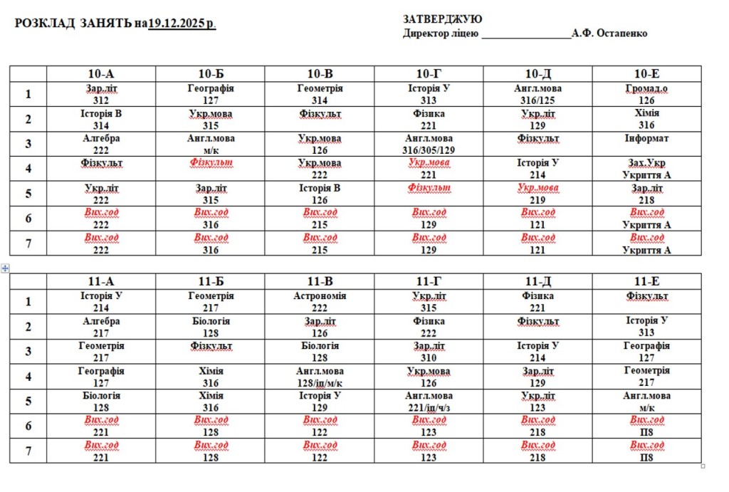 Розклад навчальних занять на 19.12.25