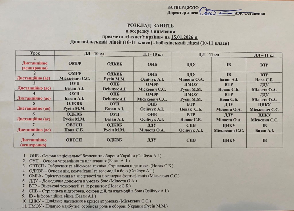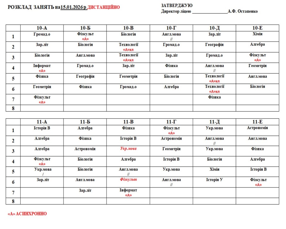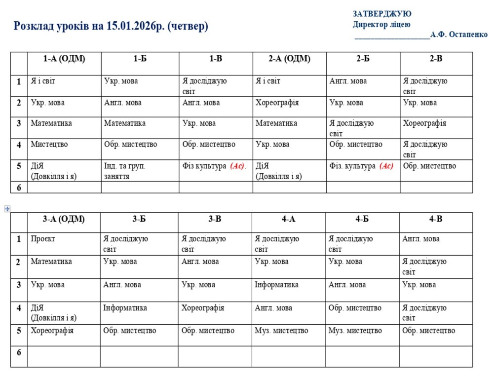Розклад навчальних занять для учнів 1-11 класів на 15.01.2026 року