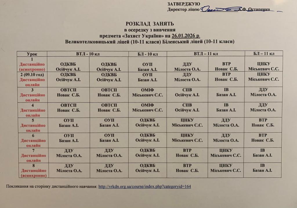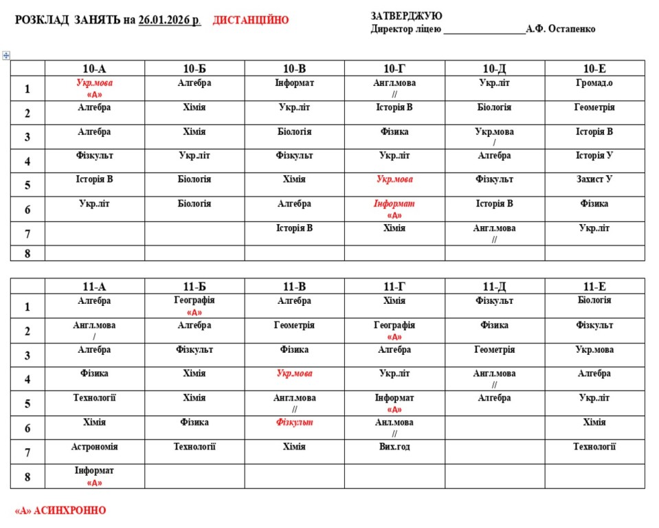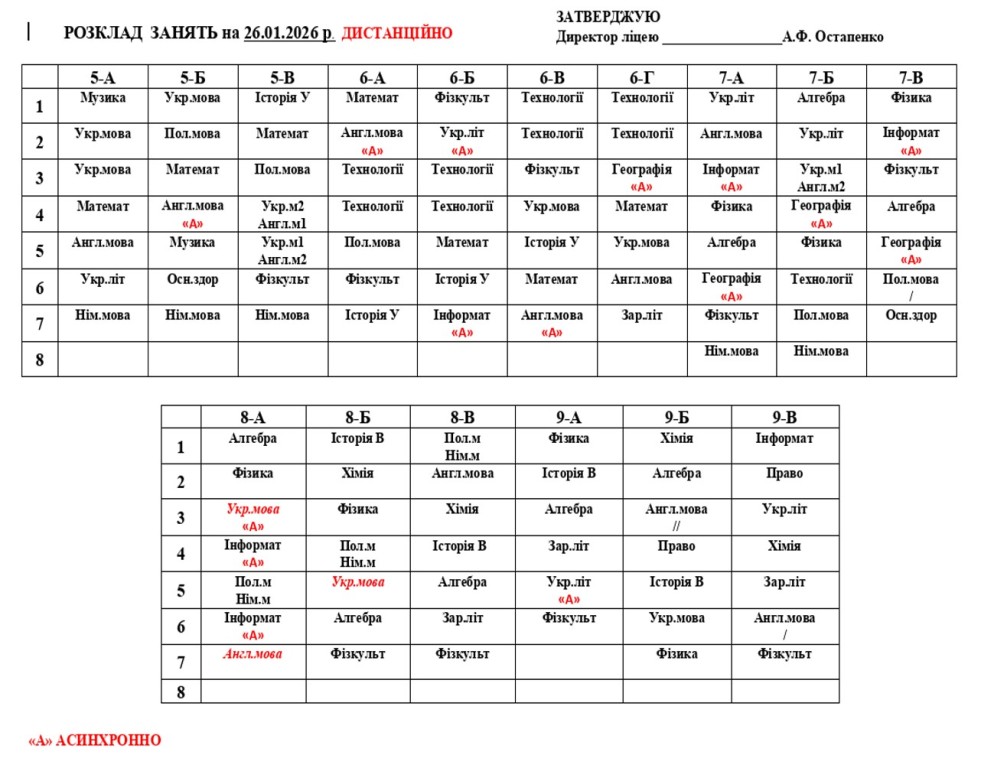 З турботою про безпеку учнів, зважаючи на виклики сьогодення - вимикання електроенергії та складні погодні умови, ухвалено рішення про продовження дистанційного формату навчання. У період з 26 по 30 січня 2026 року освітній процес у ліцеї відбуватиметься у дистанційному форматі (синхронно/асинхронно) з використанням платформи дистанційного навчання відповідно до затвердженого розкладу. Ми переконані, що спільними зусиллями - відповідальністю педагогів, підтримкою батьків, старанністю учнів - забезпечимо безперервність навчання навіть у непростих умовах. Дякуємо за розуміння, організованість та співпрацю. Про дальший формат навчання буде повідомлено додатково.