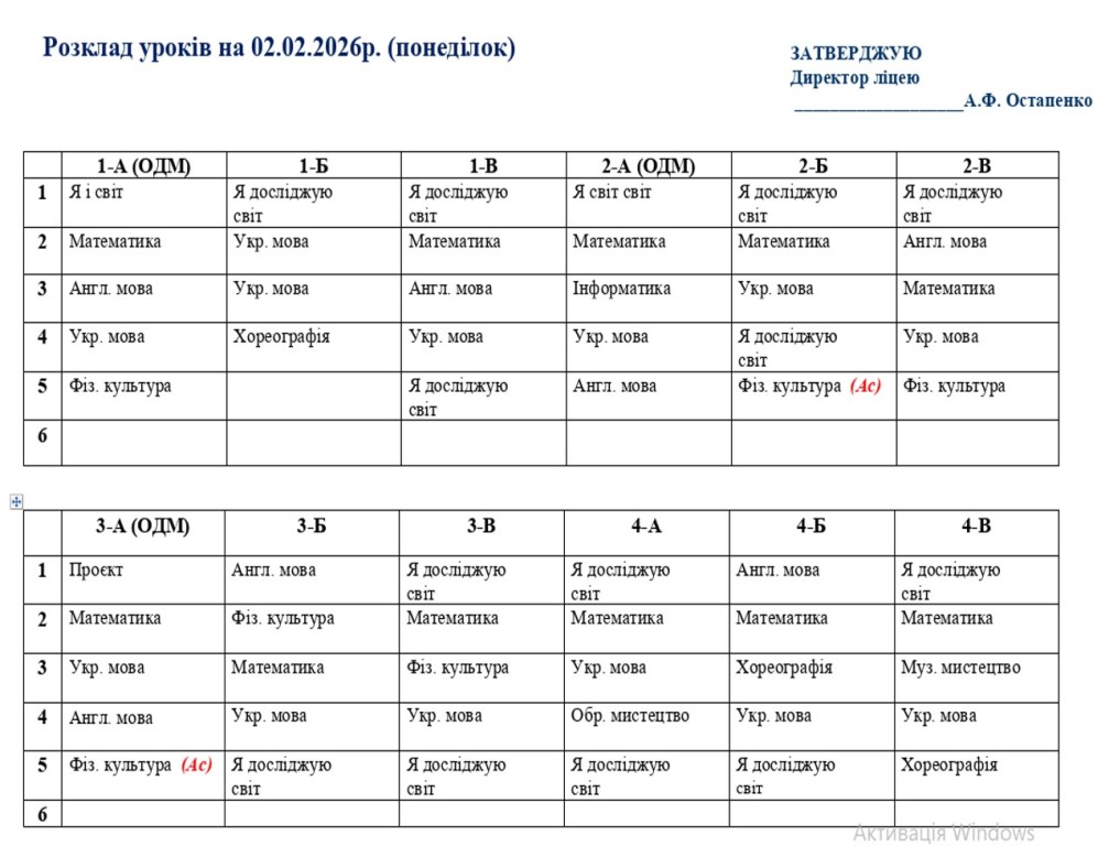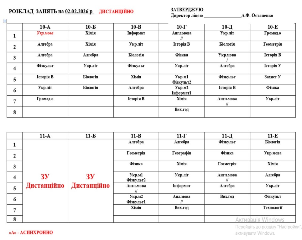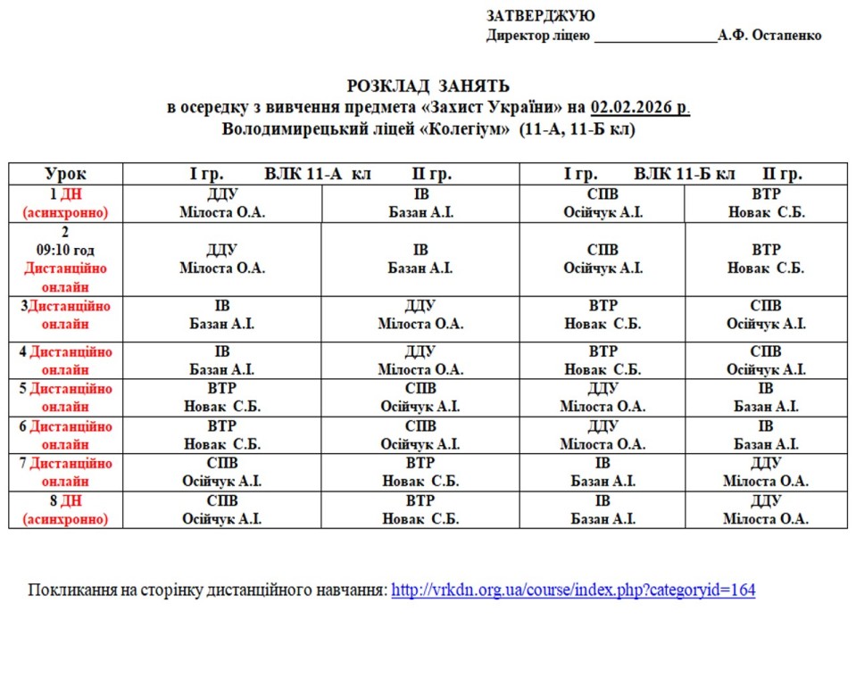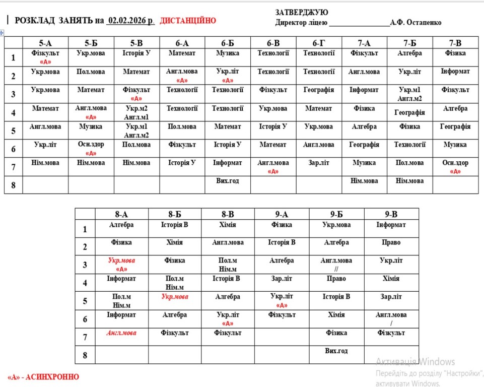 Відповідно до листа Управління соціально-культурної сфери Володимирецької селищної ради № 78/01-26 від 30.01.2026, у зв’язку зі зниженням температури повітря, відповідно до Державних санітарних норм і правил ДСанПіН 5.5.2.008-01, а також перебоями з електропостачанням освітній процес у період з 02 лютого по 06 лютого 2026 року у ліцеї здійснюватиметься у дистанційному форматі (синхронно та асинхронно) з використанням платформи дистанційного навчання відповідно до затвердженого розкладу.