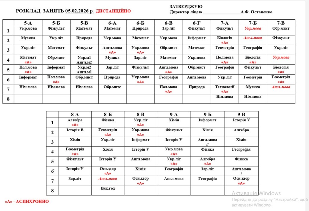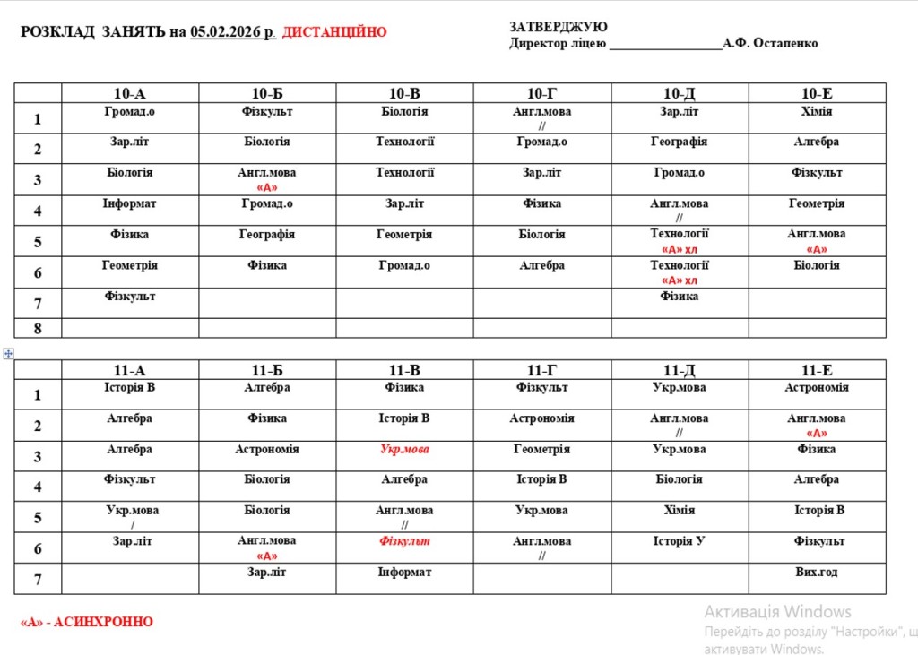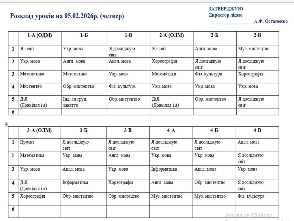 Розклад навчальних занять 1-11 класів на 05.02.26