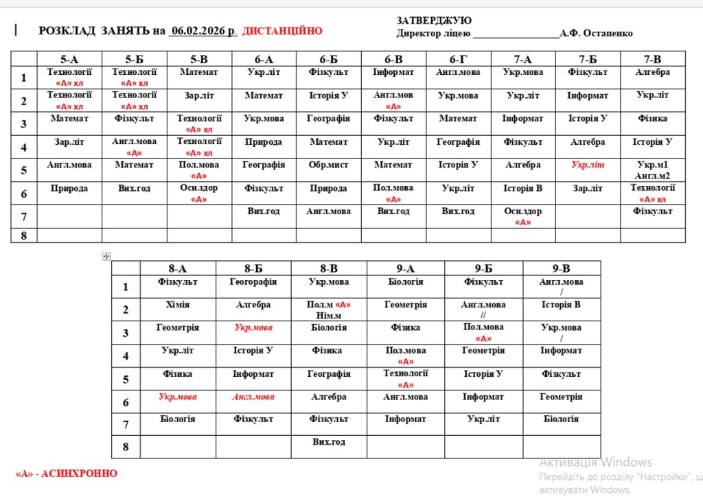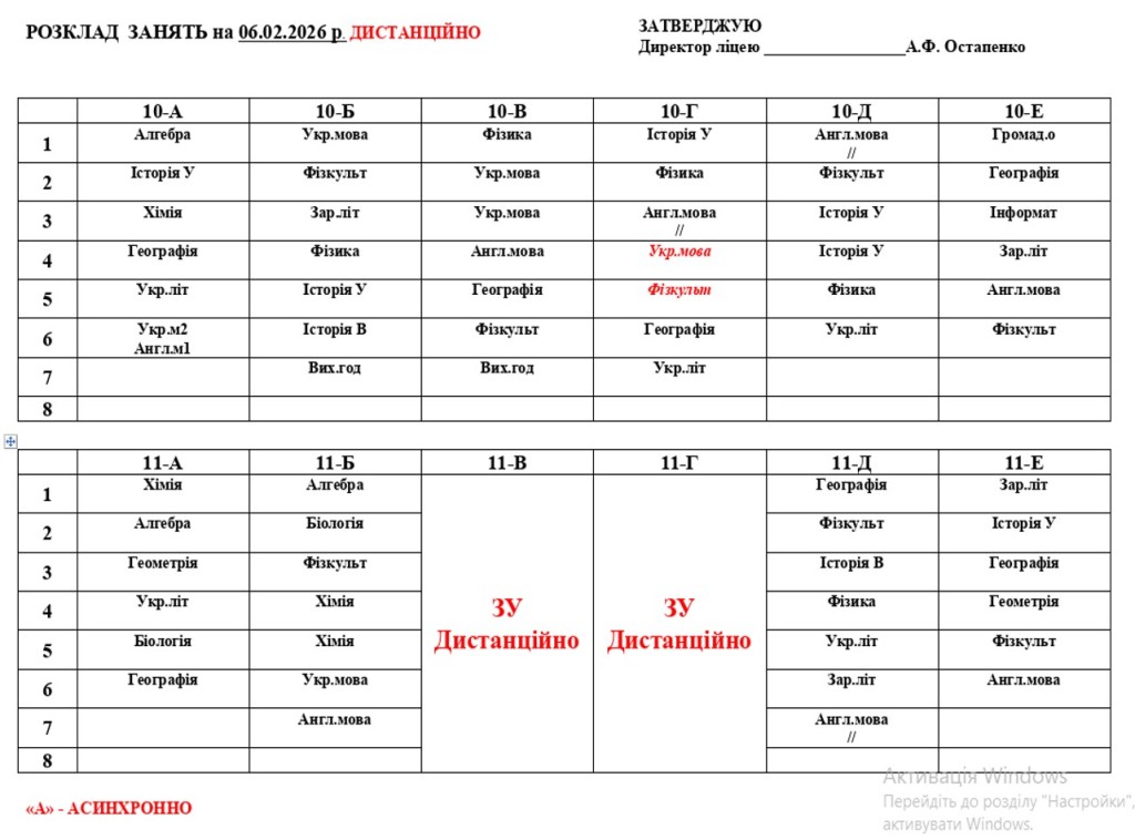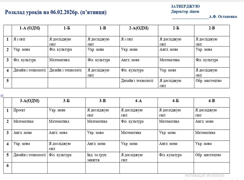 Розклад навчальних занять 1-11 класи на 06.02.26