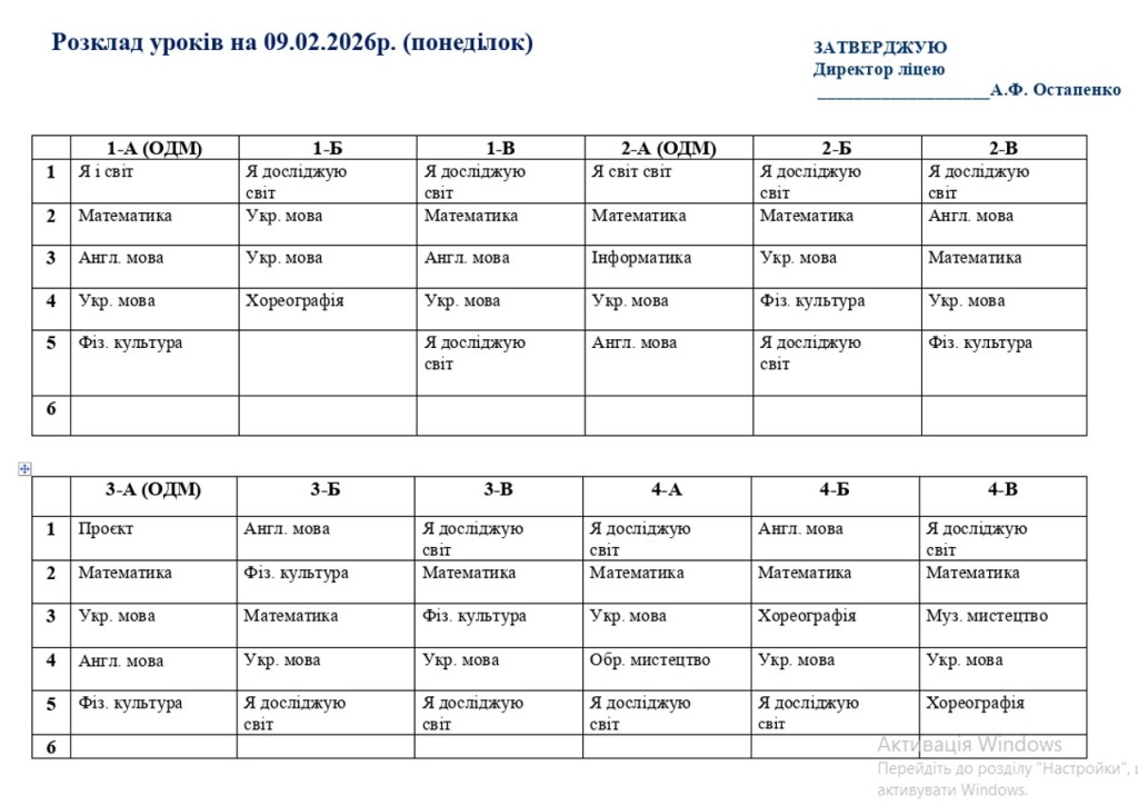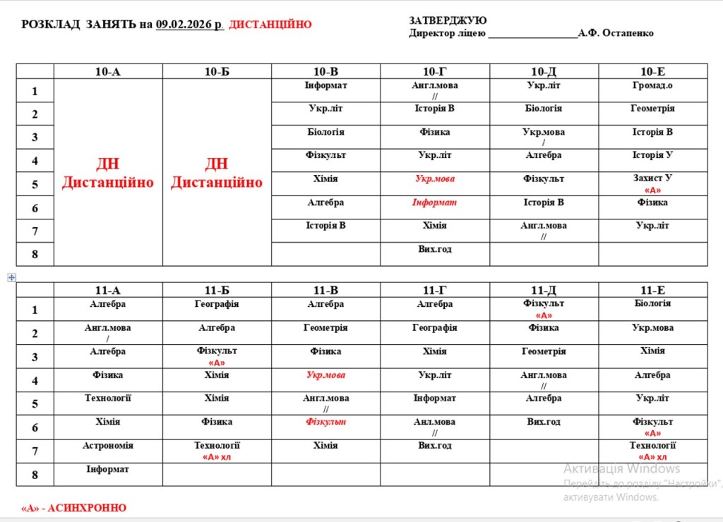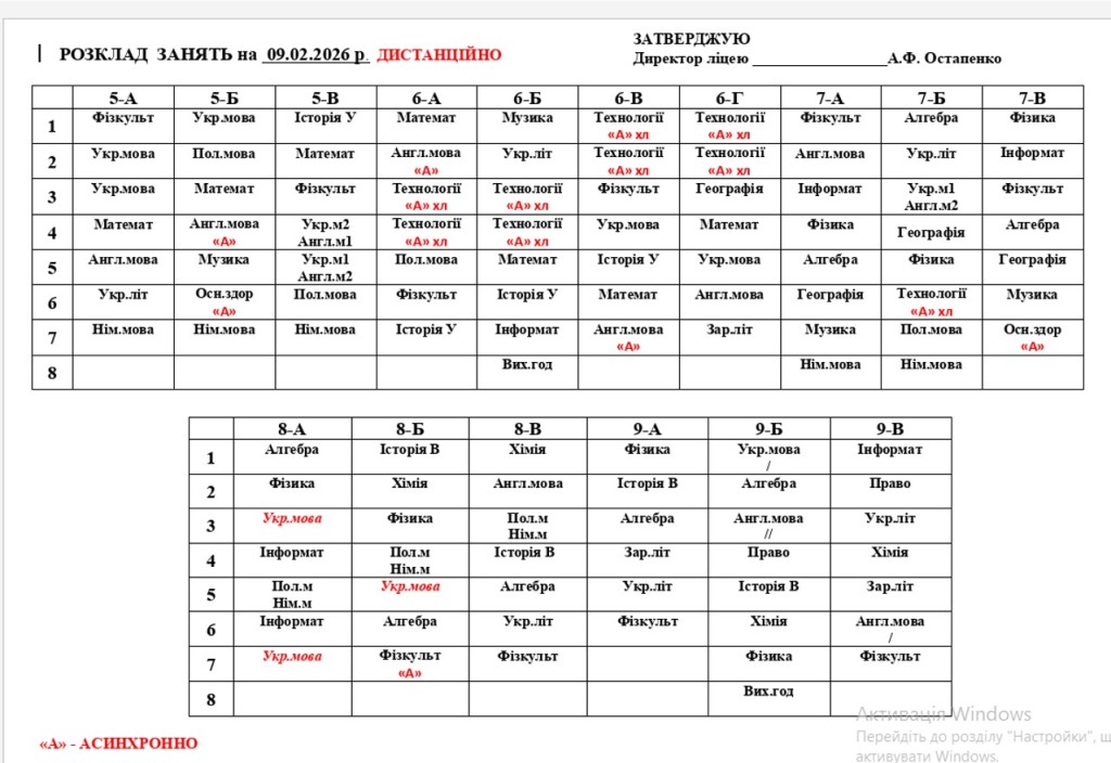 - 09–10 лютого 2026 року — освітній процес у дистанційному форматі для учнів 1–11 класів;