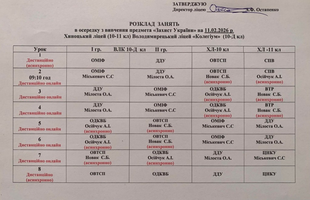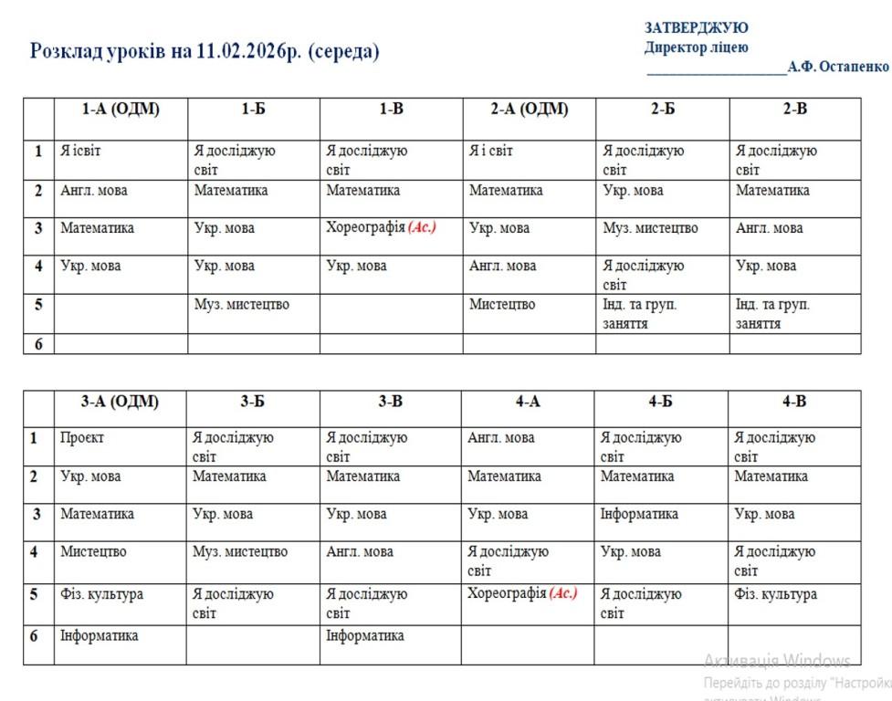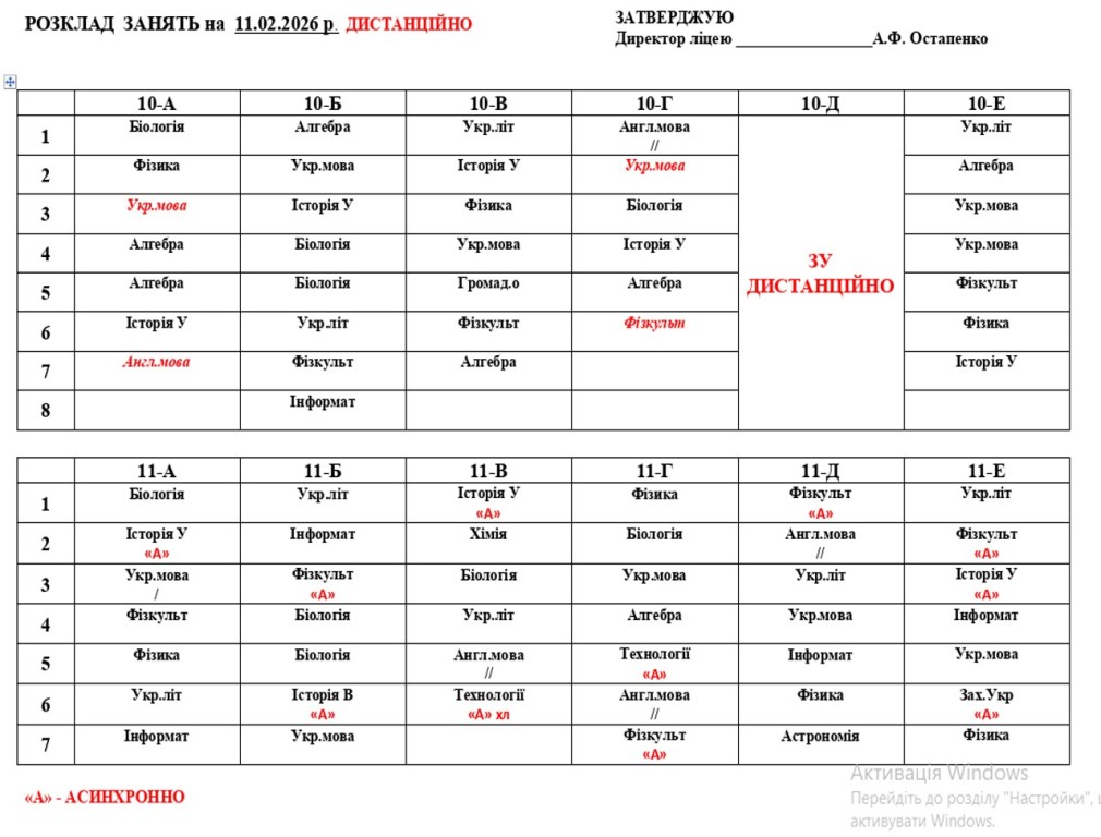 Розклад навчальних занять для учнів 1-11 класів на 16.01.2026 року
