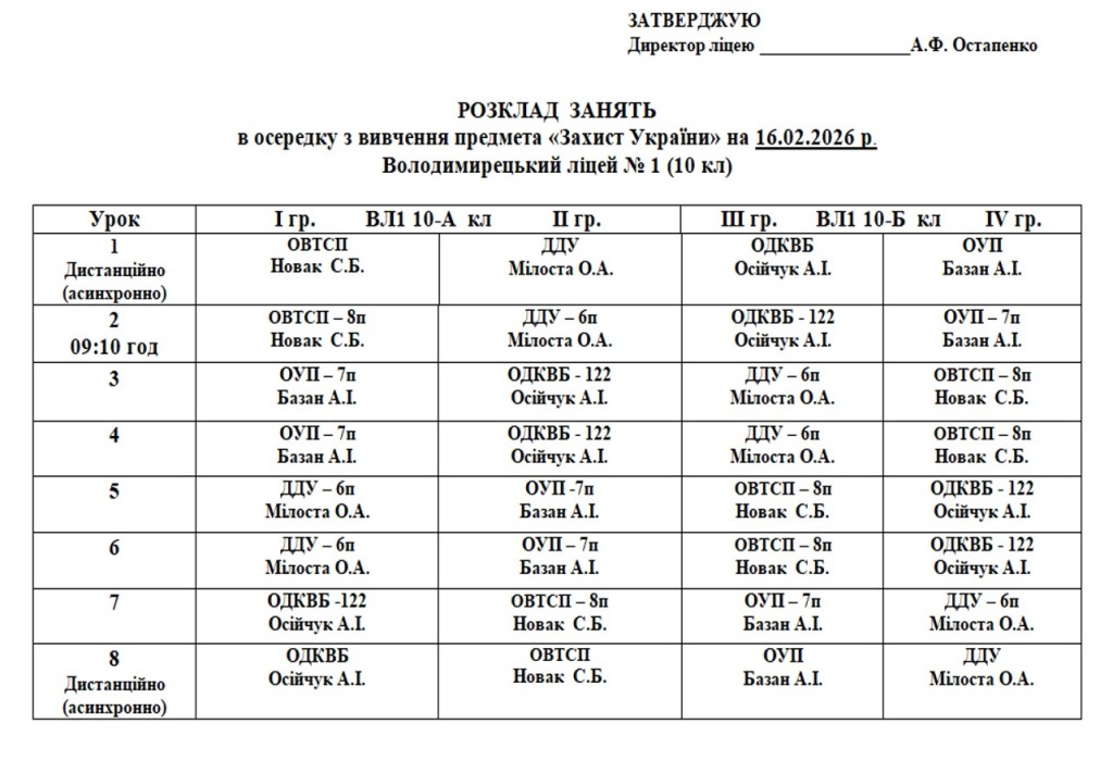 Розклад навчальних занять на 16.02.2026 року