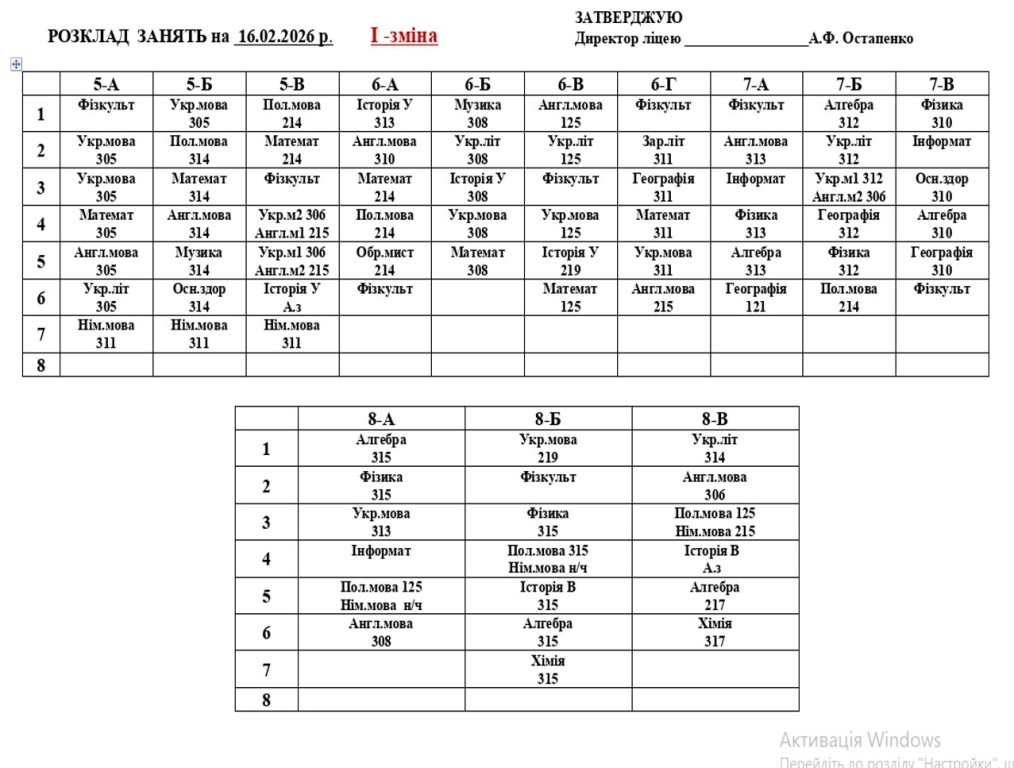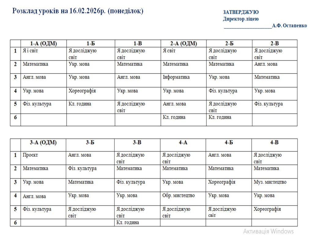 Розклад навчальних занять для учнів 1-11 класів на 16.01.2026 року