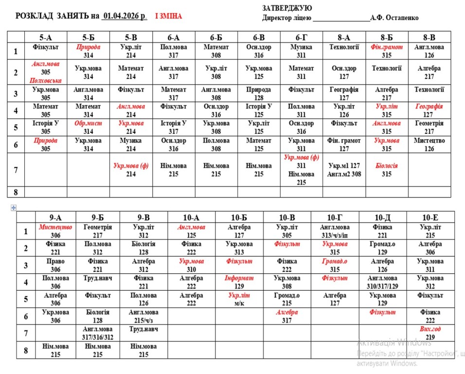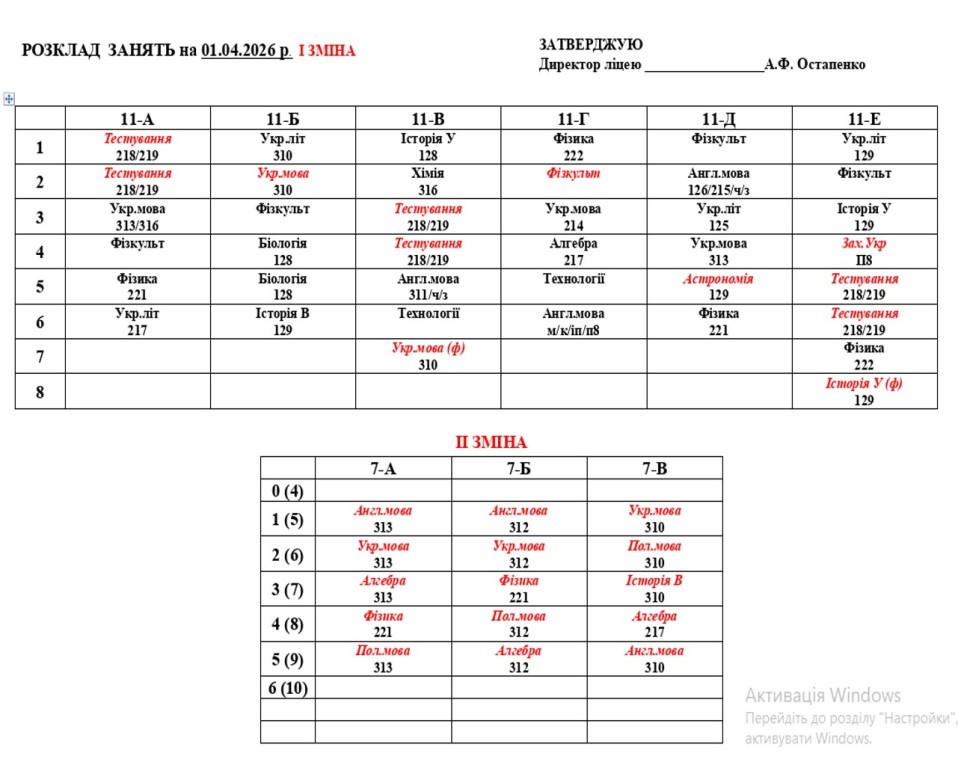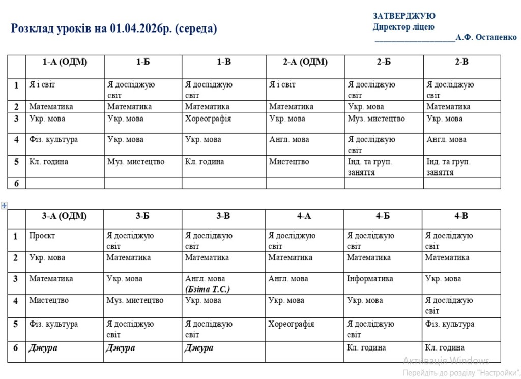 Розклад занять на 01.04.2026 року