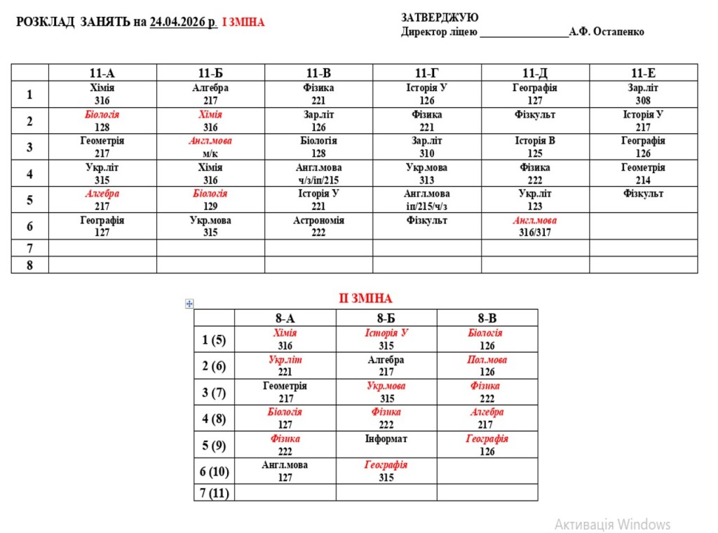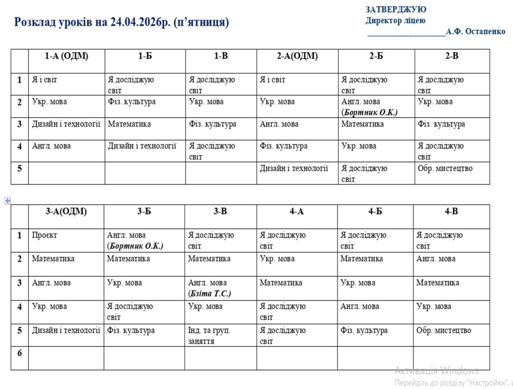 Розклад навчальних занять на 24.04.2026 року
