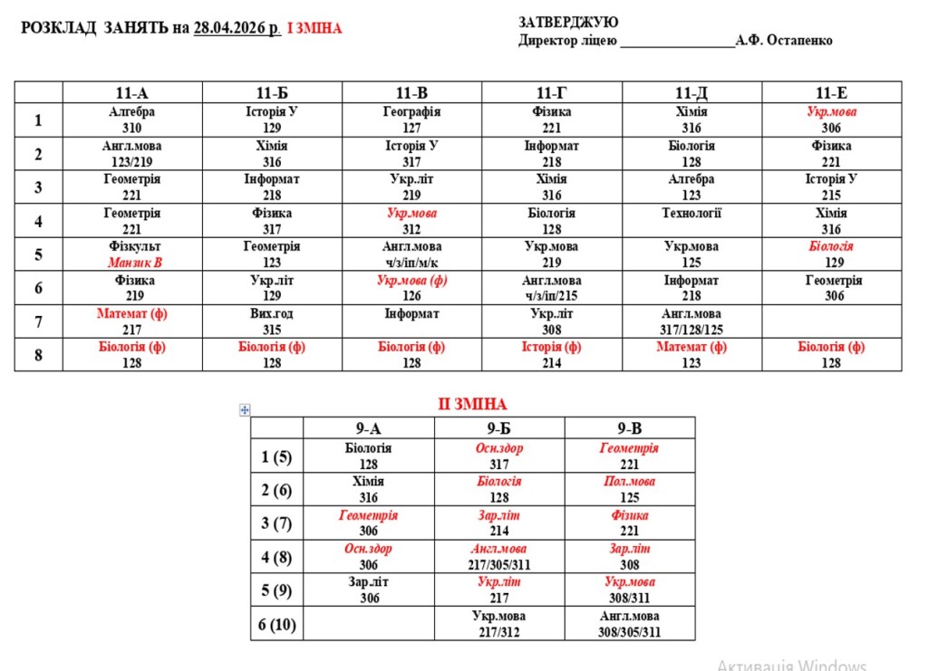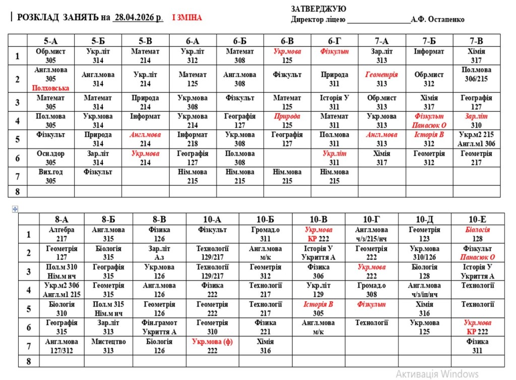 Розклад навчальних занять на 28.04.2026 року