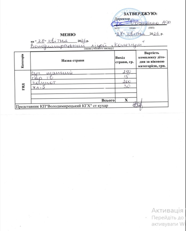 Меню на 28.04.2026 року
