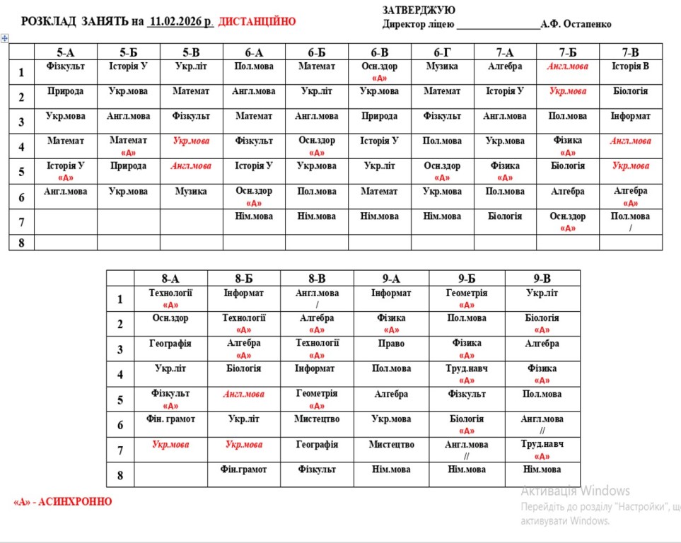 Розклад навчальних занять 1-11 класів на 05.02.26