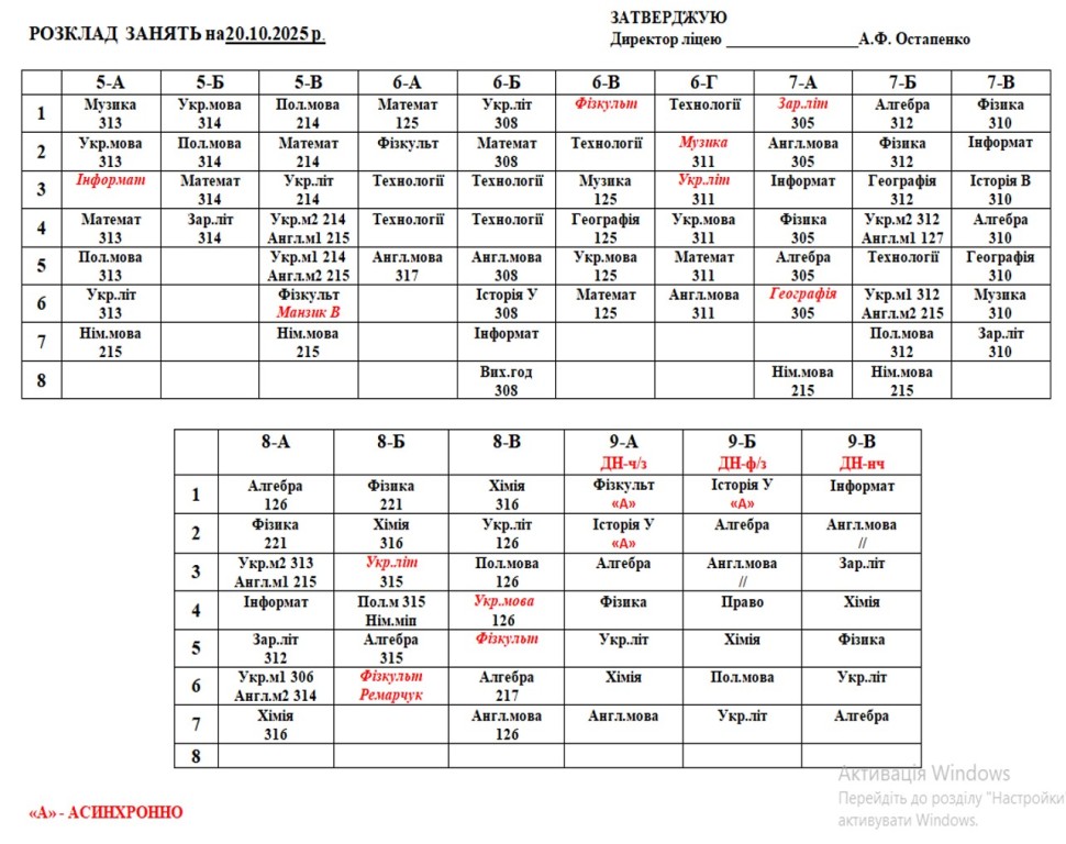 Розклад навчальних занять для учнів 5-11 класів на 20.10.2025 р.