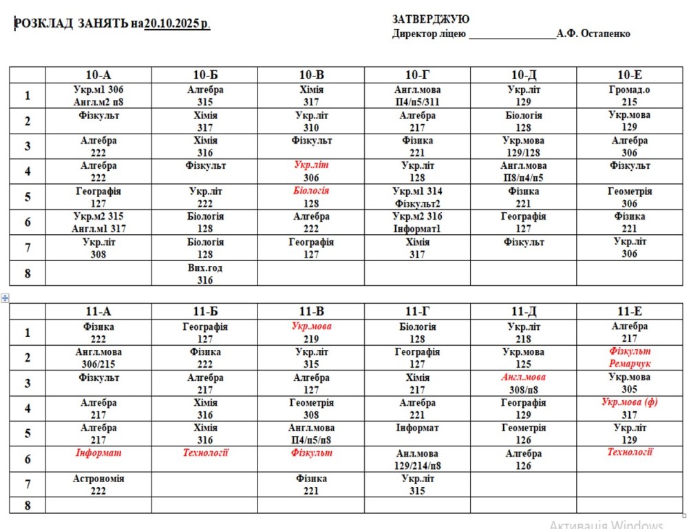 Розклад навчальних занять для учнів 5-11 класів на І семестр 2025-2026 навчального року