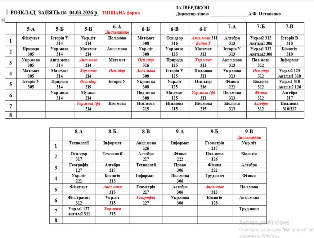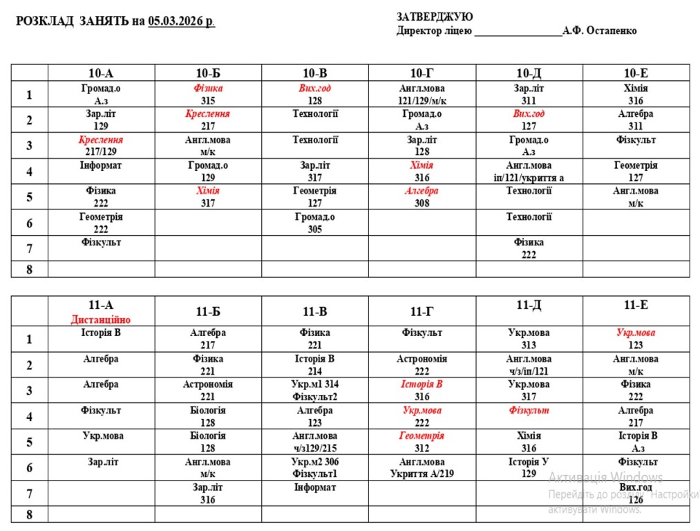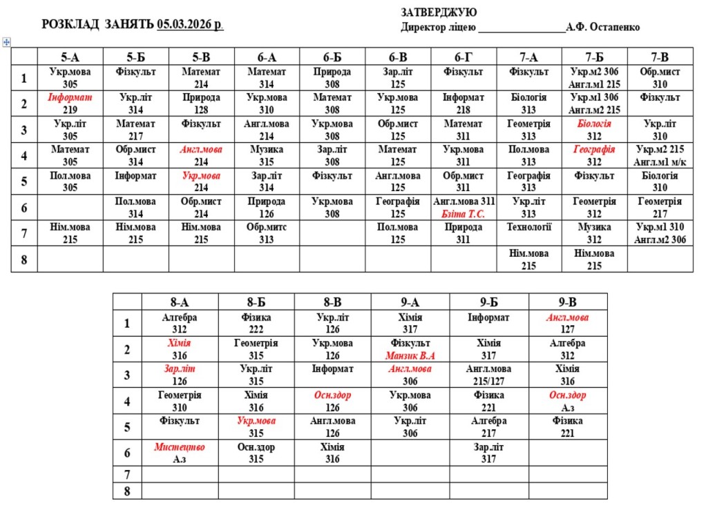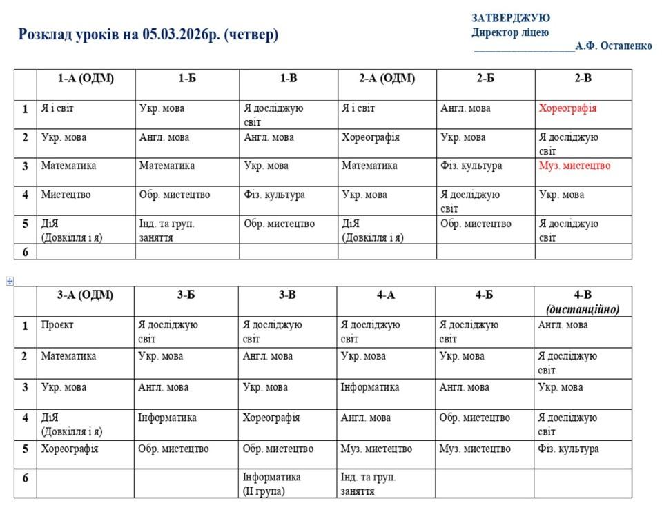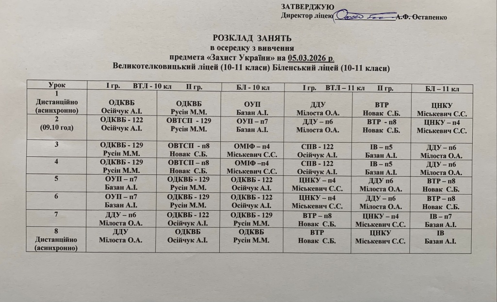 Розклад навчальних занятьна 05.03.2026 року