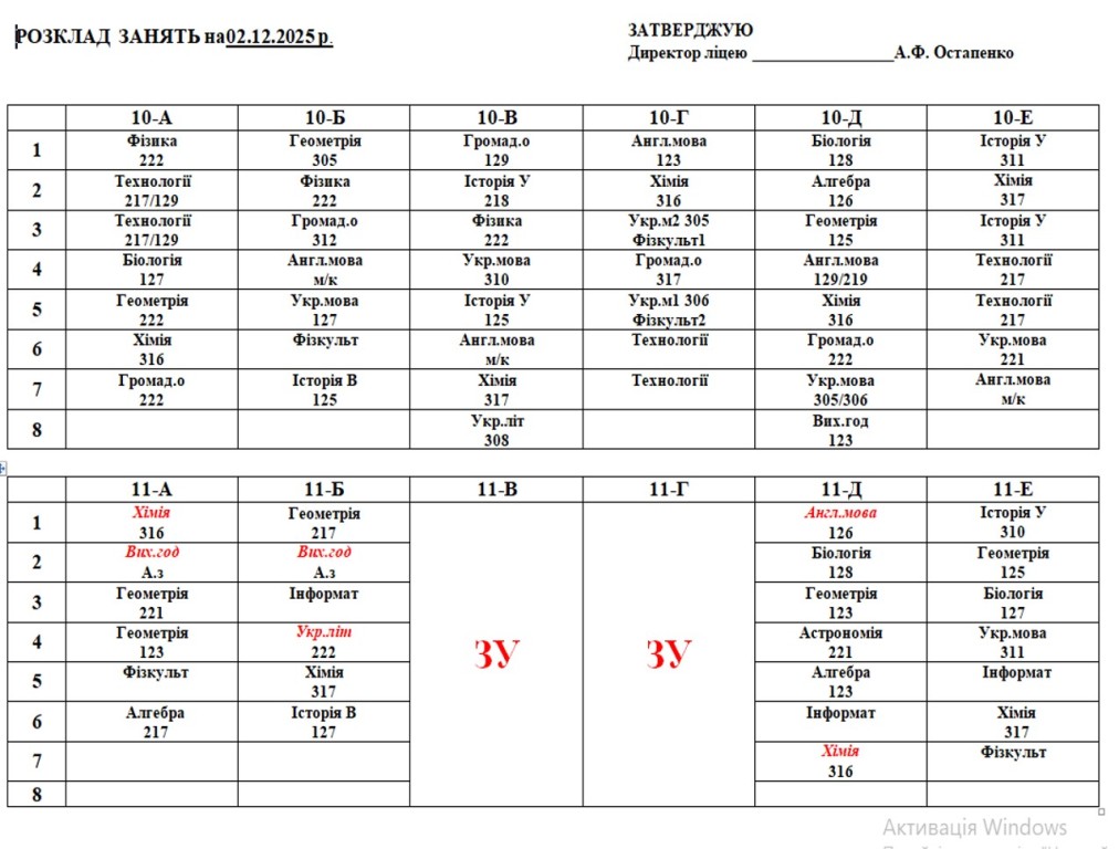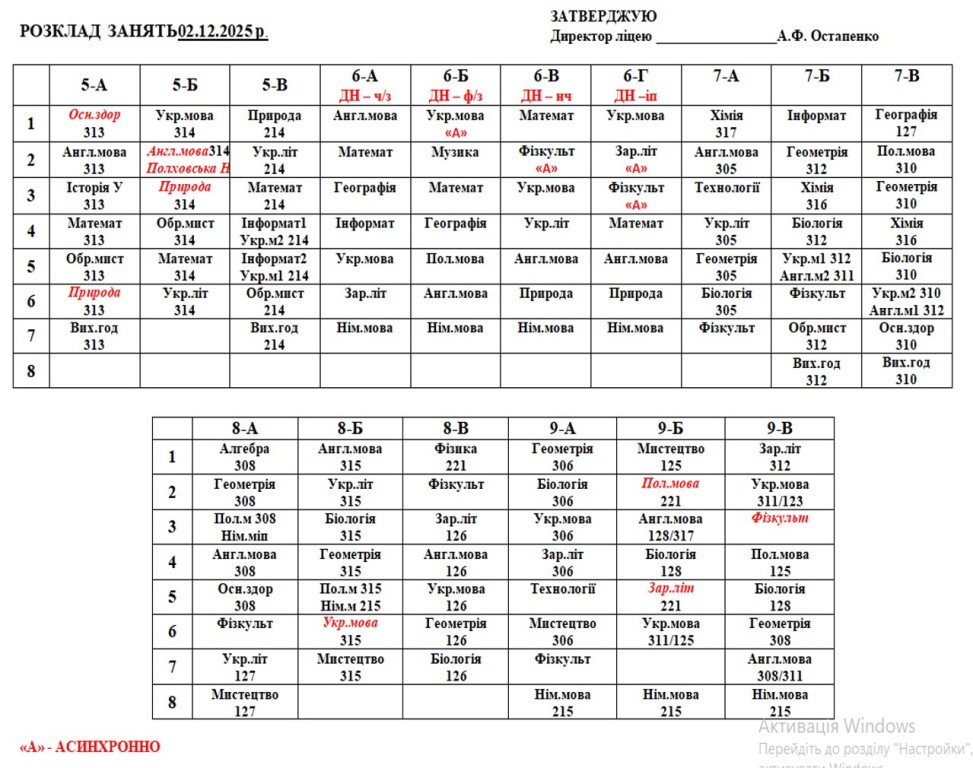 Розклад навчальних занять для учнів 1-11 класів на 02.12.2025 року