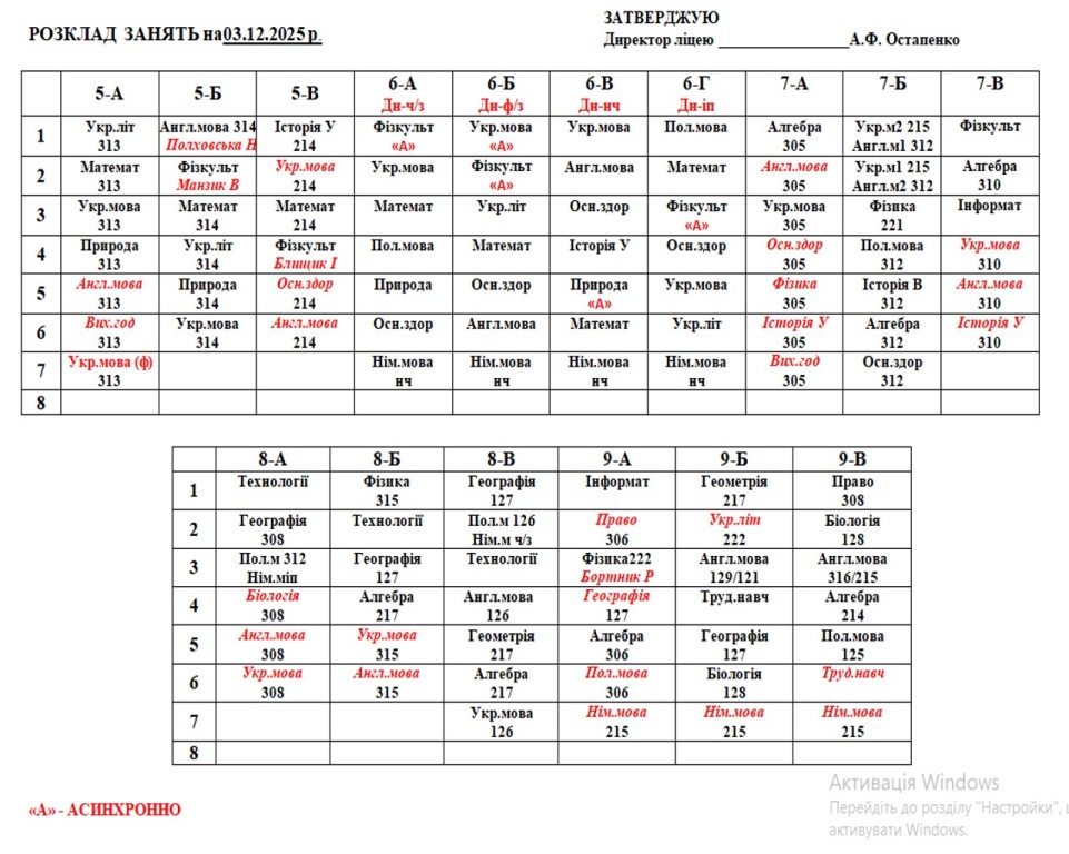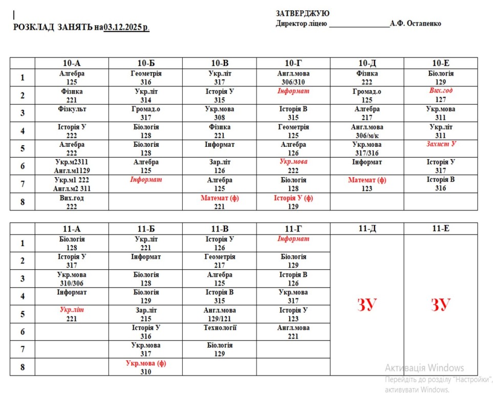 Розклад навчальних занять для учнів 1-11 класів на 03.12.2025 року