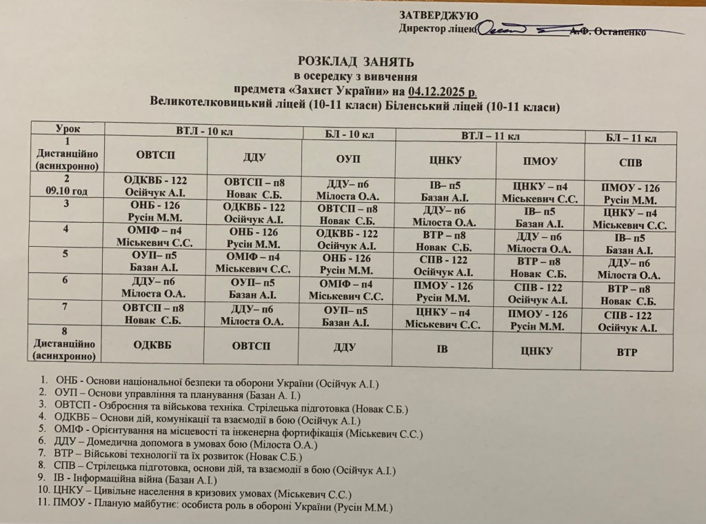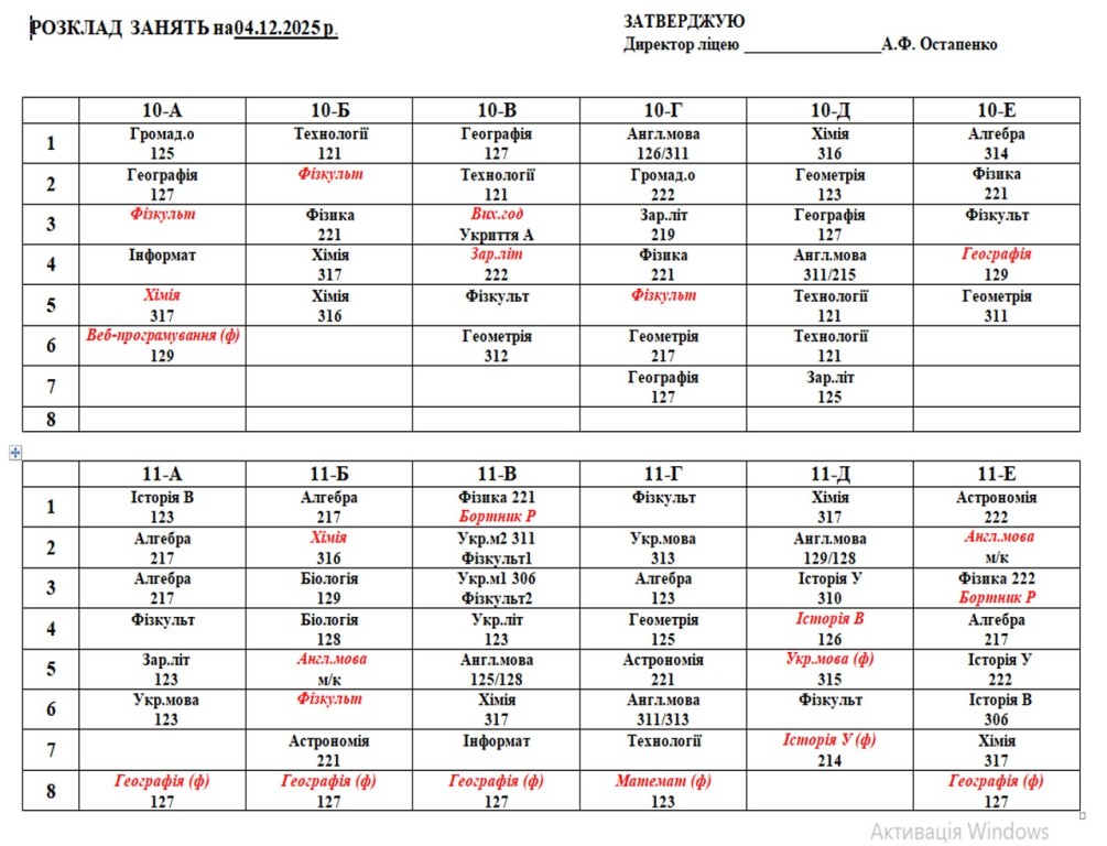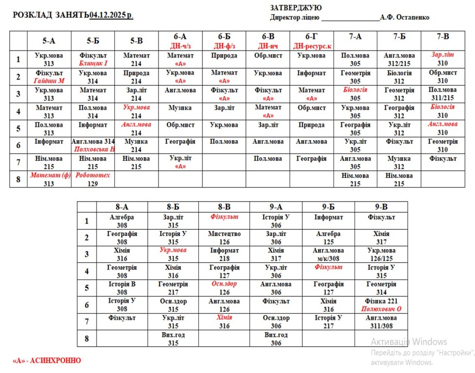 Розклад навчальних занять для учнів 1-11 класів на 04.12.2025 року