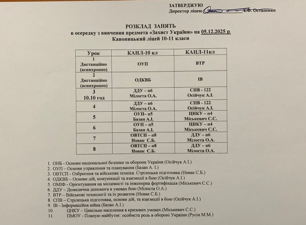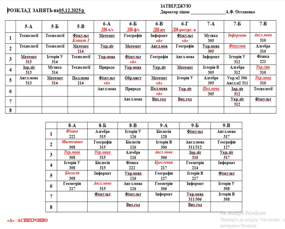 Розклад навчальних занять для учнів 1-11 класів на 05.12.25 року