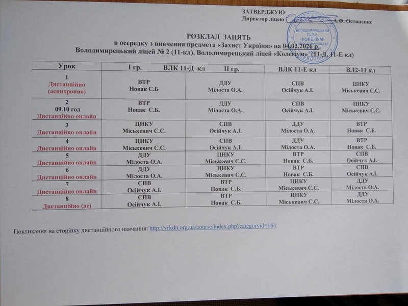 Розклад навчальних занять 1-11 класів на 04.02.26