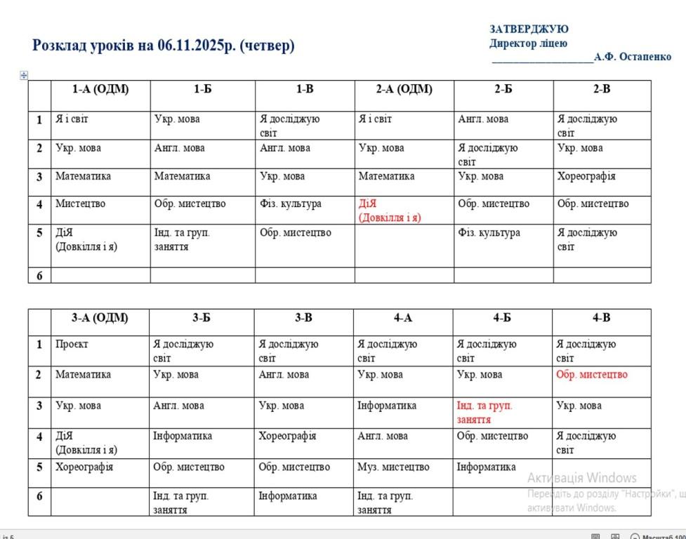 Розклад навчальних занять для учнів 1-11 класів на 06.11.2025 року